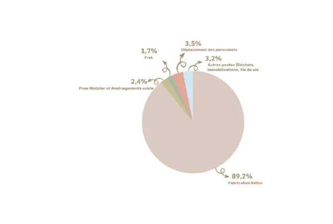 Cette étude révèle que, pour un aménagement réalisé selon les modes opératoires et moyens habituels à ce type de réalisation, c’est le poste fabrication du béton qui contribue proportionnellement le plus aux émissions de GES (environ 90 %). Au sein du matériau béton, c’est bien la fabrication du ciment qui est le poste le plus contributif, là encore de façon