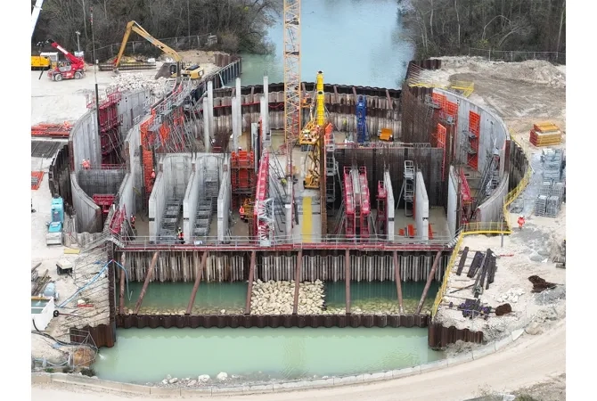 « Nous avons commencé par ceinturer l’enceinte de 52 m avec des rideaux de palplanches stabilisées par des tirants d’ancrage. Puis nous avons coulé 2 400 m3 de béton immergé de classe d’exposition XF1/XC3/XC4/XD1 (F) – un béton qui se consolide très vite – pour former le bouchon du batardeau principal. L’ancrage de cet ouvrage est renforcé par 339 pieux en béton injecté répartis à l’intérieur de l’enceinte. Après une vidange, nous avons réalisé le radier – 250 m3 de béton – et les superstructures en béton de classe d’exposition XD3 (F) avec ses huit pertuis de pompage. Séparés des pompes, deux pertuis de vidange gravitaire complètent l’équipement. Au total ce sont 4 000 m3 de béton qui ont été nécessaires pour réaliser cet ouvrage », explique encore Pascal Laugier.