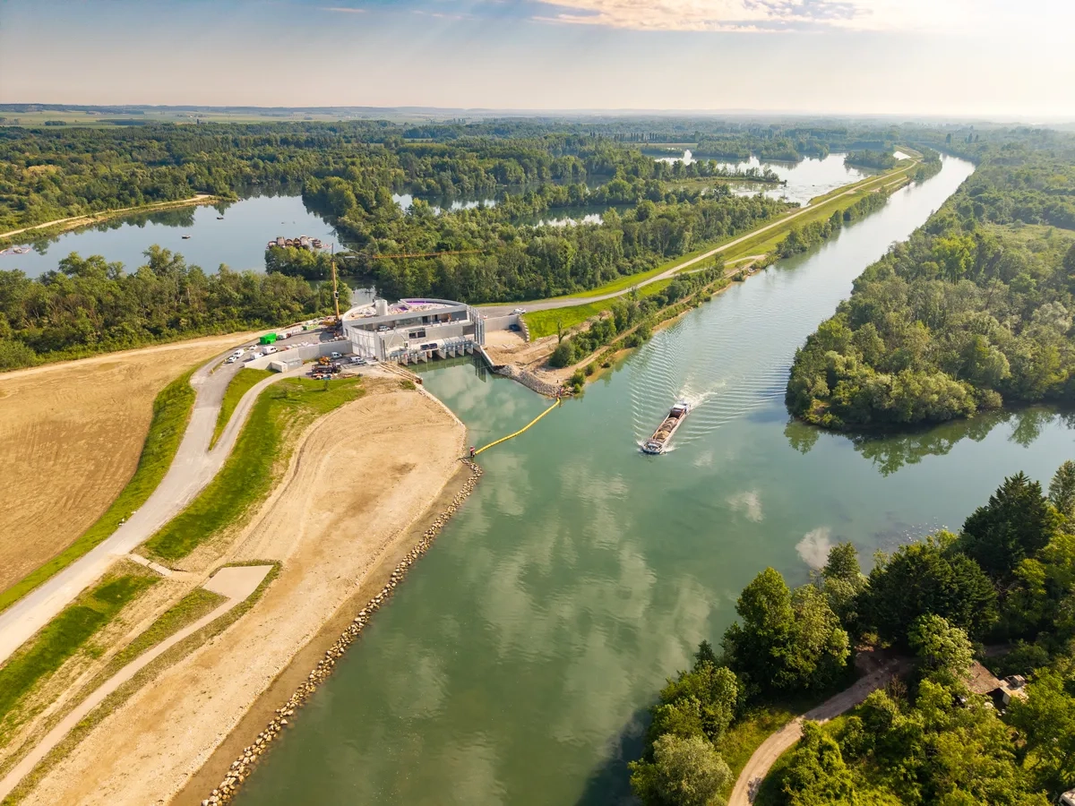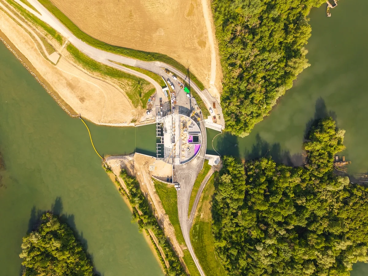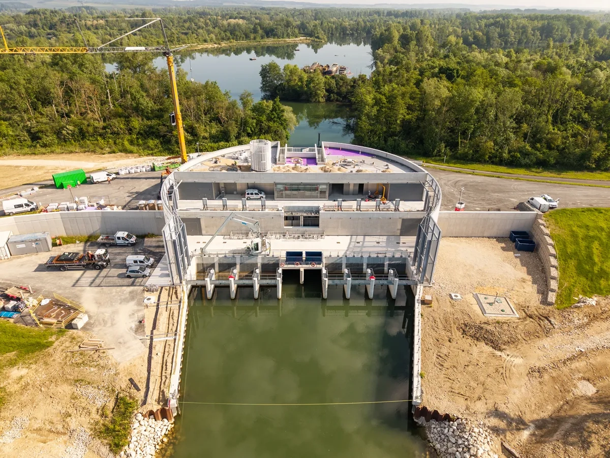 - Maîtrise d’œuvre de conception : Setec/Hydratec (mandataire), BET hydrologie digue et ouvrages annexes ; Artelia, BET génie civil et équipement ; LWA (APS) puis Ateliers 2/3/4/ (DCE), architectes ; Écosphère (écologue) ; Land Act, paysagiste