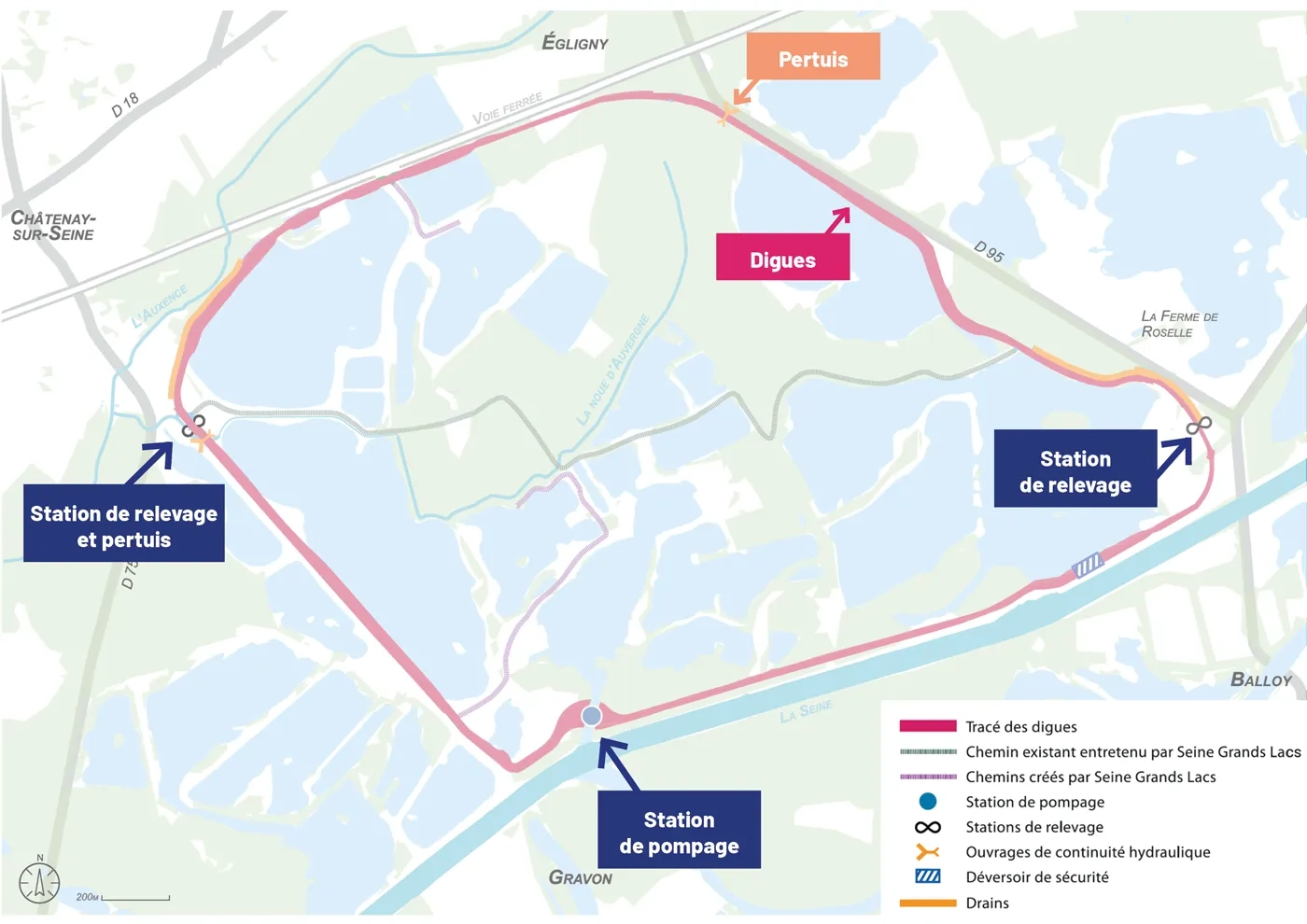 Le projet global de la Bassée comprend neuf ouvrages, dont un premier aujourd’hui réalisé. Ce premier espace endigué, dénommé « Site pilote », a été réalisé entre 2022 et 2024 pour être mis en service en 2025. Complétant quatre autres grands lacs réservoirs mis en place au cours du XXe siècle en Champagne et dans le Morvan, ce dispositif anti-crue permettra à lui seul d’abaisser le niveau de la Seine d’environ 10 à 15 cm selon les crues.