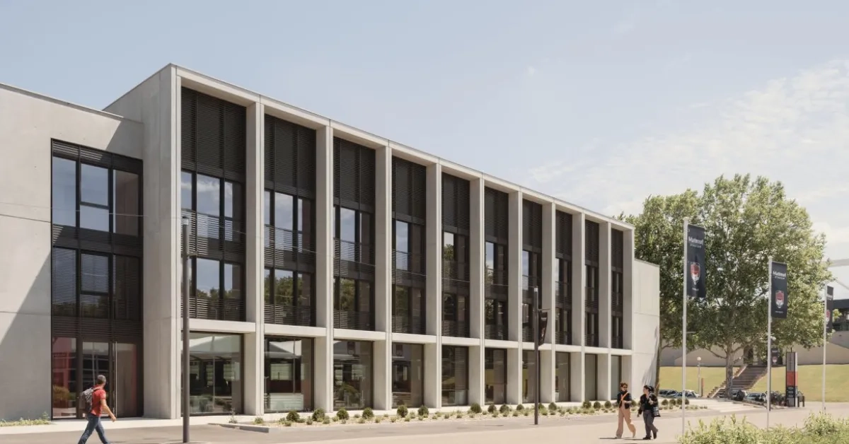 L’intégralité des portiques – poteaux, poutres, casquettes – et des loggias ont été préfabriqués contrairement aux murs pignons et refends coulés en place. Dans les extensions, les éléments de structure en béton sont associés à des poutres métalliques qui franchissent les portées : un choix dicté par l’urgence du chantier qui n’a duré que 22 mois. Toujours dans cette recherche d’une simplicité apparente et d’une cohérence du bâti, le béton est d’une même teinte gris claire quelle que soit sa mise en œuvre, il fait le lien entre l’ancien et le nouveau, l’histoire et le contemporain.