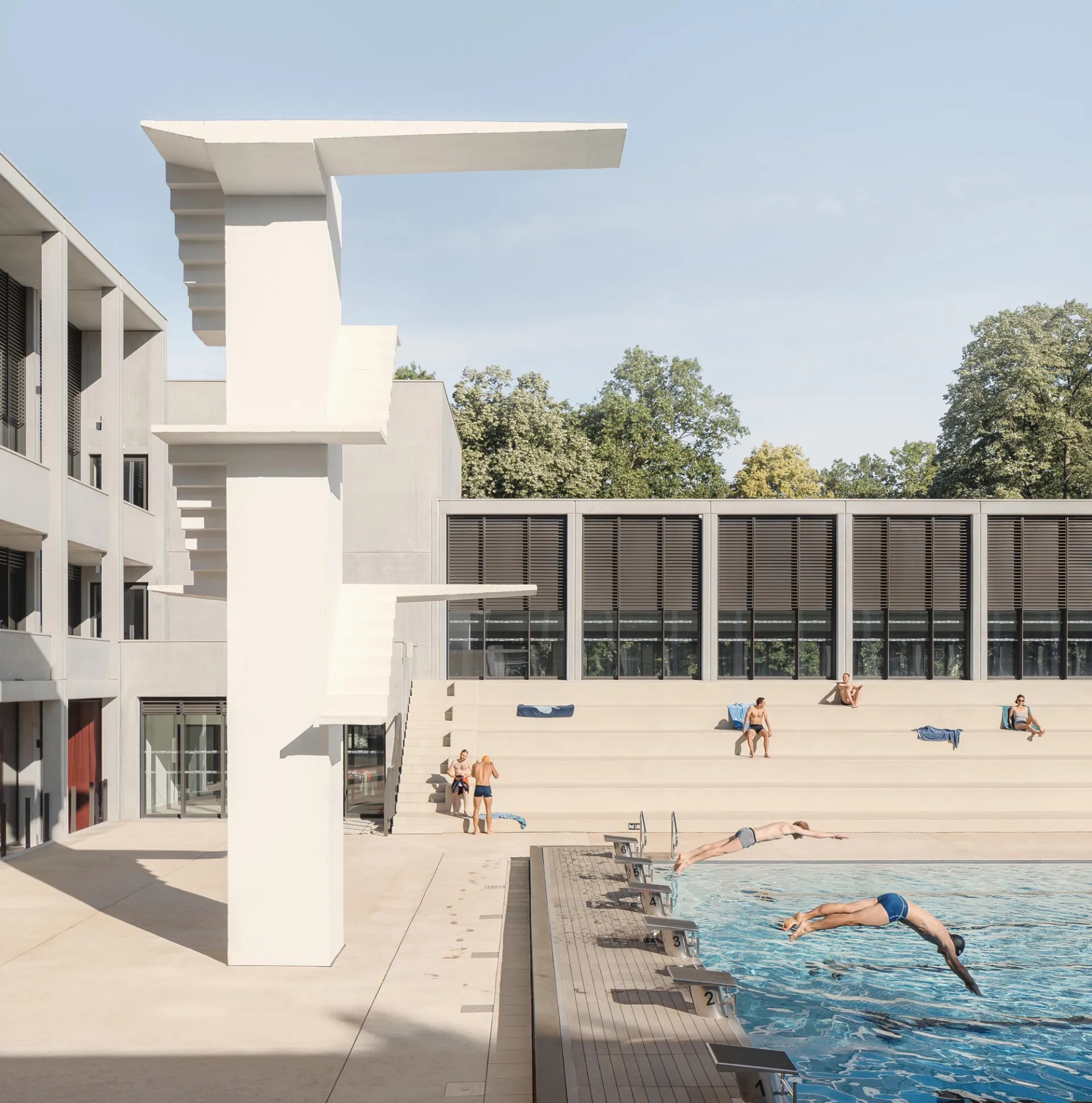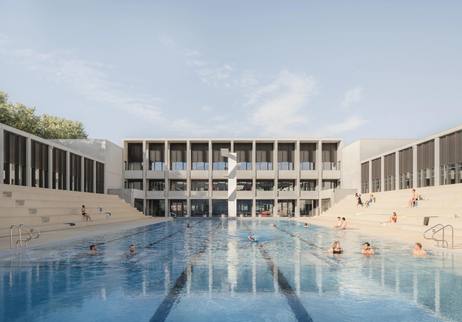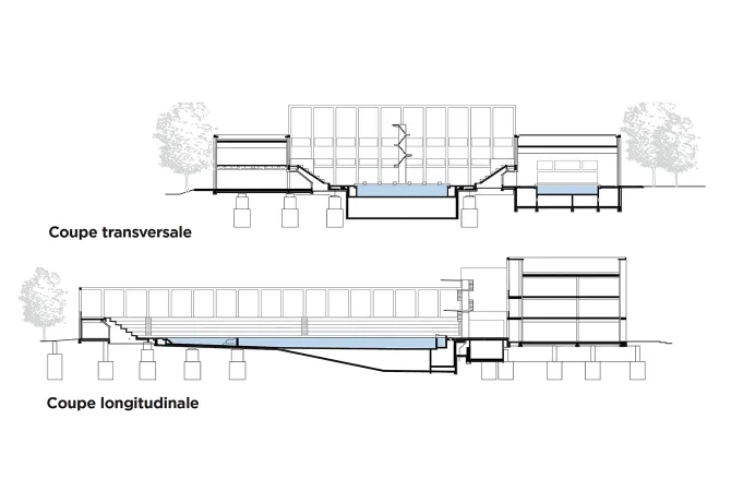 L’aile ouest, de 18 m de largeur, abrite un bassin d’apprentissage de natation de 25 m de longueur, visible depuis l’extérieur mais en retrait de la voie grâce à un jardin « qui intègre un système d’infiltration de 100 % des eaux pluviales », précise Olivier Mazet, chef de projet de l’agence 4_32 architecte, et des vestiaires. Elles sont articulées par deux volumes intermédiaires à un édifice de bureaux qui ferme la composition au sud et marque l’allée des Lions par sa hauteur (R+2) rendue imposante par la modénature de sa façade nord. Ces deux volumes, qui contrastent par leur aspect massif et opaque avec leurs voiles de béton toute hauteur, contiennent les circulations verticales et les sanitaires des bureaux et du centre de performance contribuant à la flexibilité de leur aménagement. L’ensemble forme ainsi un écrin-écran en U autour de l’ancienne piscine, jouant sur les volumes et les hauteurs de manière à dessiner un épannelage gradué. Ces extensions accusent cependant un léger retrait bienvenu vis-à-vis des usagers de la piscine, par les coursives-loggias équipées de garde-corps opaques sur la façade des bureaux ou émergeant en hauteur à l’arrière des gradins.