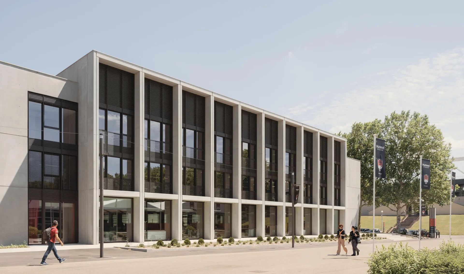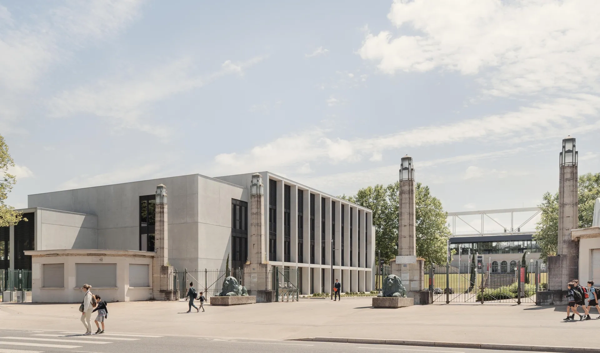 L’assise du centre reprend les fondations construites par Tony Garnier. « Nous avons dédoublé la trame et l’avons décalée afin de ne pas peser sur les fondations en béton de graviers conservées à titre de vestiges, expliquent les architectes. Trois idées fortes ont guidé la conception architecturale. La verticalité en jouant sur l’allée des platanes. La monumentalité voulue par Tony Garnier, marquée notamment par les portiques monumentaux en béton brut de la façade nord qui rythment l’entrée du stade sur l’allée des Lions. Le jeu des transparences qui laisse entrevoir l’activité du centre, notamment la piscine couverte, fermée sur l’extérieur par des murs-rideaux vitrés, de même que la salle d’entraînement. » L’emploi du béton comme matériau d’expression architecturale, ici d’une élégante modernité, s’accorde au projet d’origine et contribue à la cohérence du projet à l’échelle du site autant qu’aux exigences de pérennité et de résistance à un environnement agressif, humide et chloré. La trame régulière des façades est marquée par les portiques dont la profondeur varie de 40 cm à 1 m en fonction des usages et des orientations : brise-soleil au sud, murs-rideaux côté jardin. Leur variation de hauteur trouble la perception des niveaux et facilite la gestion des différents volumes intérieurs comme l’intégration des locaux techniques en toiture.