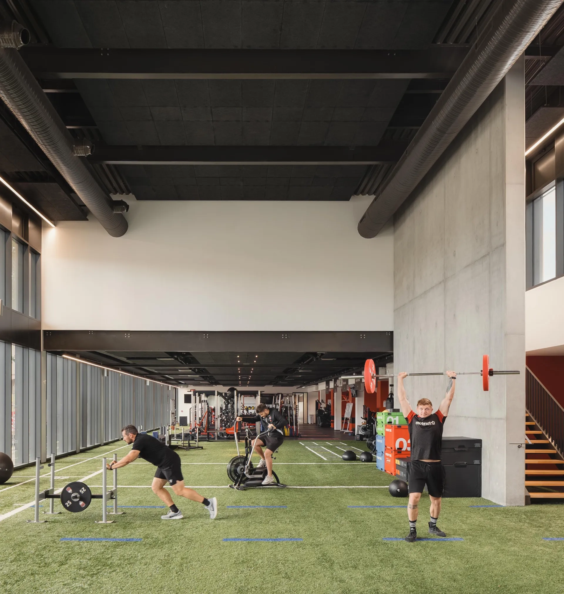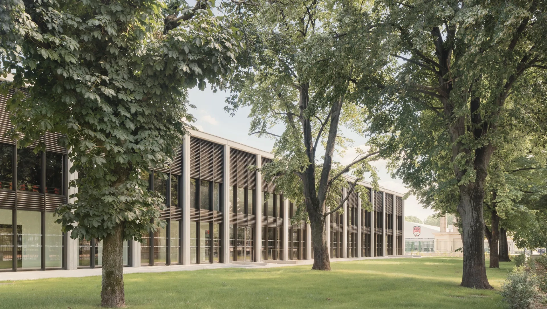 De part et d’autre de la piscine historique, à l’arrière des gradins, s’étirent deux corps de bâtiment d’un étage sur 75 m de longueur et de 8,5 et 9 m de hauteur. L’aile est, plus étroite (13 m) afin de ne pas toucher aux arbres du parc sur lequel elle s’ouvre, est dédiée à l’entraînement des rugbymen professionnels –piste de course, terrain synthétique, espaces de vie et de soins, etc.