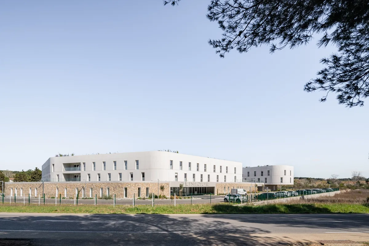 L’ancienne clinique Provence-Azur située dans le village d’Éguilles, aux portes d’Aix-en-Provence, était devenue vétuste. Le site de remplacement retenu, en lisière de la plaine voisine, s’inscrit dans un territoire en transition, entre terres agricoles, zones pavillonnaires et équipements urbains. La maîtrise d’ouvrage attendait un outil fonctionnel adapté aux exigences d’un équipement médical pluridisciplinaire. Parmi les priorités figuraient l’optimisation des distances, la distinction des flux patients/visiteurs et la continuité du parcours de soins. Un marché privé suivi d’une commande directe a dès lors été lancé.