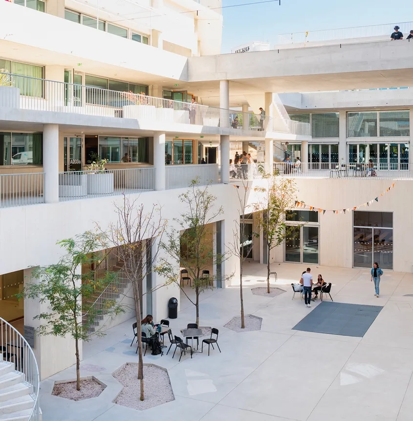 Les trois bâtiments de l’Institut sont organisés autour de trois espaces extérieurs : la cour d’accueil, la cour d’expérimentation et la pinède. Ces lieux de vie collective s’échelonnent de façon continue dans la pente du terrain, qui présente 10 m de dénivelé entre la place Jules-Guesde, en partie basse, et la rue Joseph-Biaggi, en limite haute de la parcelle. La cour d’accueil vient en prolongement de la place et du hall d’entrée au rez-de-chaussée. À cet étage, dans des espaces de 6 m de hauteur se trouvent les éléments les plus collectifs du programme : les amphithéâtres au pied du bâtiment recherche, la cafétéria sous les ateliers et, côté pôle commun, l’espace d’exposition, le « forum ». Au R+2, la cour d’expérimentation se développe transversalement jusqu’à la rue Nédélec sur laquelle elle possède un accès direct. Grâce à leur façade escamotable, la halle d’expérimentation et l’atelier maquette peuvent s’ouvrir totalement et se prolonger sur cette cour, dont une partie est protégée par une serre permettant d’abriter des intempéries les prototypes ou les expérimentations. Enfin, la pinède, qui s’étend jusqu’à la rue Joseph-Biaggi, offre un havre de végétation méditerranéenne. En complément de ces trois espaces extérieurs, tout un ensemble de coursives, de passerelles, de loggias, de terrasses parcourent et ponctuent l’ensemble de l’Institut. Les ateliers et les salles de cours peuvent ainsi s’ouvrir et se prolonger sur l’extérieur, proposant aux étudiants une grande diversité de lieux de travail, de rencontre, de discussion, de détente. Tous ces dispositifs extérieurs constituent comme une superposition de sols. Ils irriguent l’édifice, facilitent les relations transversales entre les corps de bâtiment et les différents niveaux.
