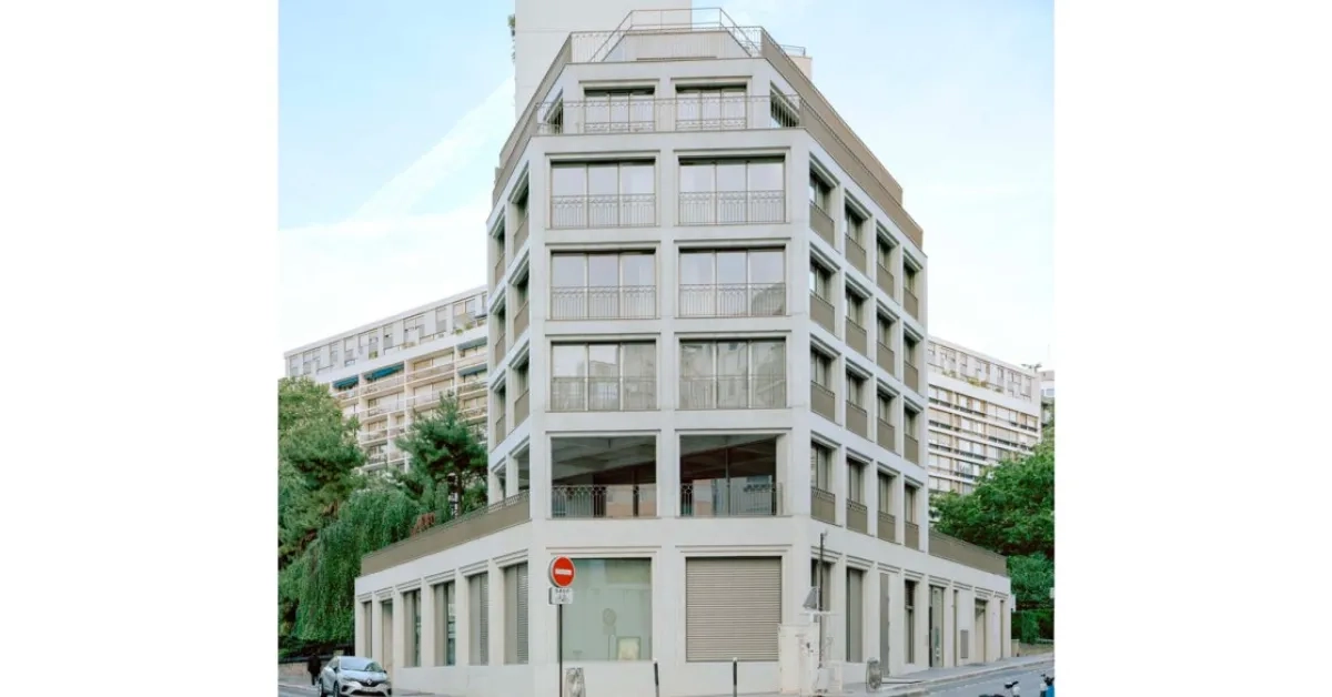 Édifié entre 1965 et 1968 par Arthur Héaume et Alexandre Persitz, tous deux formés auprès d’Auguste Perret, l’immeuble de quatorze niveaux affirme une présence massive au carrefour. Il faut dès lors composer avec cet imposant voisin, ainsi qu’avec un environnement urbain où les styles, les hauteurs et les implantations contrastés révèlent un parcellaire parisien particulièrement contrarié.