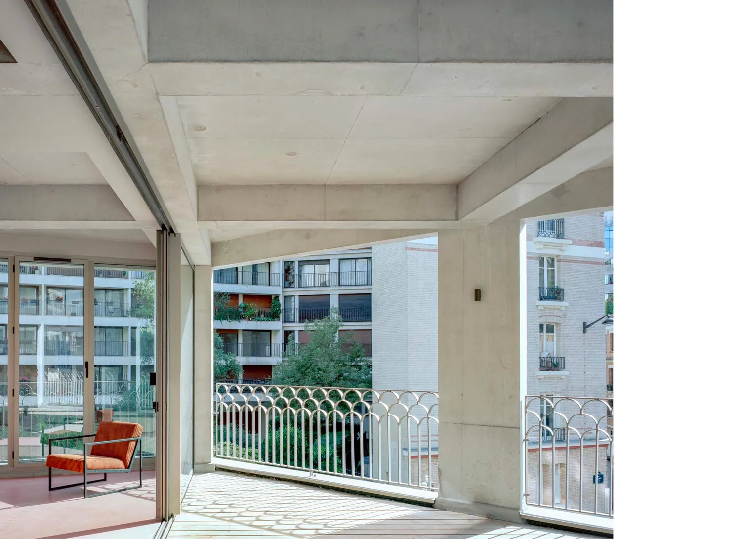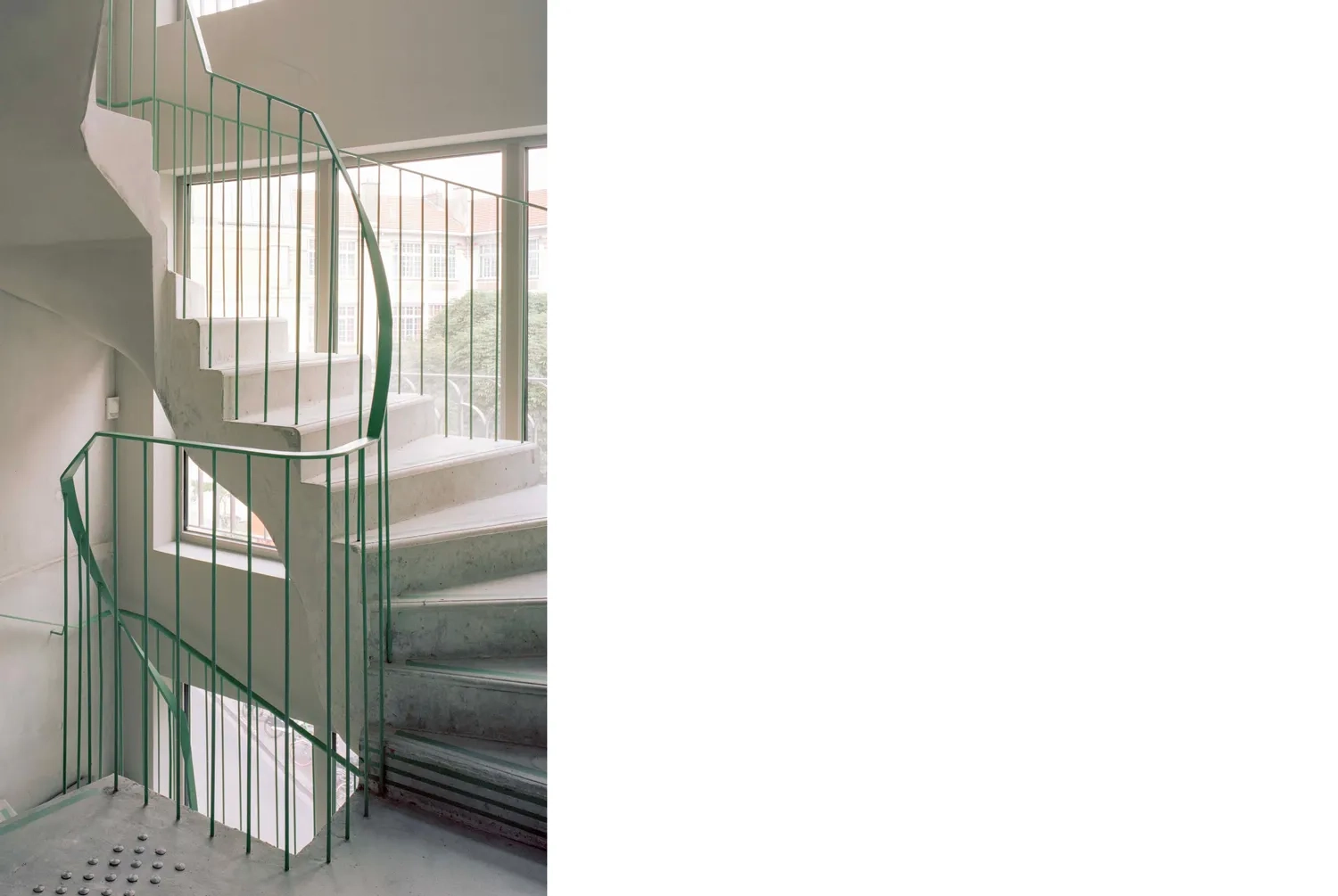 Dans les étages supérieurs, une attention particulière est portée à l’architecture du logement, conçue comme le prolongement direct de la structure de l’équipement musical. Le premier niveau accueille principalement des espaces collectifs tels qu’une cuisine avec séjour, une salle de sport, une laverie et une grande terrasse, laquelle est partiellement protégée par un creux ménagé dans le volume bâti. Ce retrait, générant un porte-à-faux, a nécessité la mise en œuvre de refends travaillant comme des poutres-voiles, participant à la stabilité de l’ensemble. La qualité d’habitabilité repose sur un soin constant apporté aux détails : larges baies vitrées amplifiant les surfaces des studios, salles de bains éclairées en second jour par des impostes, cuisines et mobilier dessinés sur mesure. Modulables, les éléments de mobilier peuvent se déplacer, se réagencer et s’encastrer afin de libérer l’espace selon les usages. Disposant d’un accès indépendant de celui de La Sirène, les 51 logements sont desservis par un volume d’escalier éclairé naturellement par de larges baies sur rue et dont le garde-corps, finement mis en œuvre, est directement scellé dans le béton.