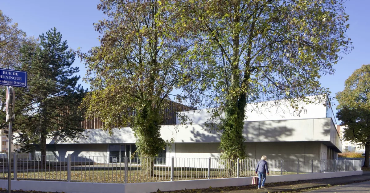 Situé au cœur du Neudorf, un quartier du sud de Strasbourg proche du centre-ville comme de l’université, l’actuel gymnase Albert-Le-Grand pourrait s’apparenter à la rencontre de deux volontés, celle de la ville et celle des architectes qui ont conçu sa restructuration et son extension. Leur objectif commun ? Offrir aux usagers un équipement qui réponde le plus précisément possible à leurs besoins tout en préservant l’environnement. Construit initialement dans les années 1960, il ne comportait à l’origine qu’une seule grande salle multisport posée sur une large surface d’enrobé utilisée comme aire de sport extérieure. Un dispositif classique devenu obsolète qu’il était urgent de transformer. La position de l’équipement à proximité de la trame verte et bleue – un réseau de réservoirs de biodiversité sillonnant la ville – décuplait l’importance d’une prise en compte environnementale.