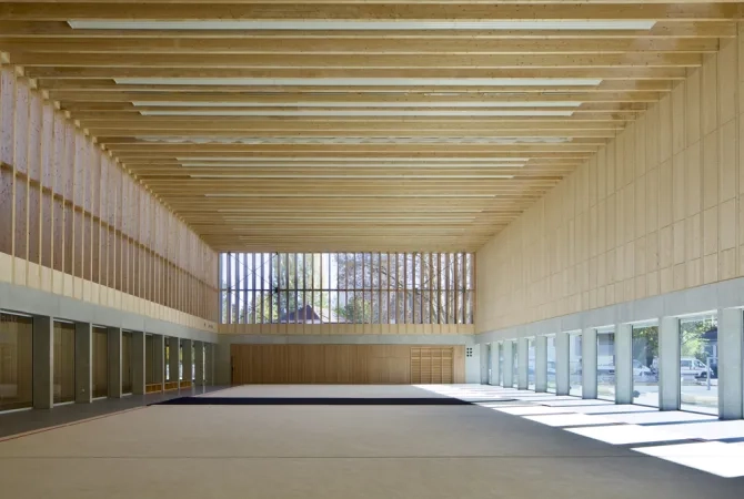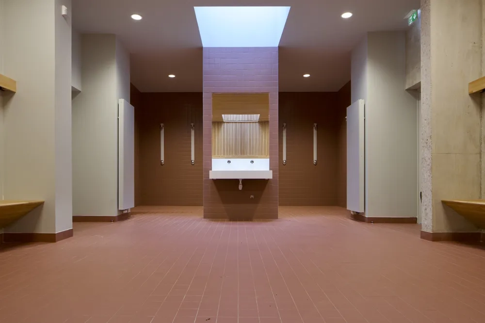 En effet, les volumes vous accueillent et vous enveloppent. C’est en partie dû au choix des matériaux, l’équipement étant quasi exclusivement réalisé en béton et en bois. Ces deux matières brutes et vivantes donnent de l’épaisseur et de la texture aux différentes surfaces. Il en résulte une atmosphère vibrante et apaisante, un effet renforcé par l’abondance de lumière naturelle qui vient mettre en valeur nuances et reliefs. Un des autres aspects plaisants à l’œil relève du rythme dégagé par le choix des trames et l’équilibre qui s’en dégage. Tout le travail a consisté à trouver un dénominateur commun entre celles applicables au bois et au béton pour créer une géométrie qui soit efficiente techniquement tout en étant harmonieuse, en particulier dans la nouvelle salle. Ce savant dosage entre contrainte et liberté découle d’un réglage fin et d’un jeu subtil sur les épaisseurs.
