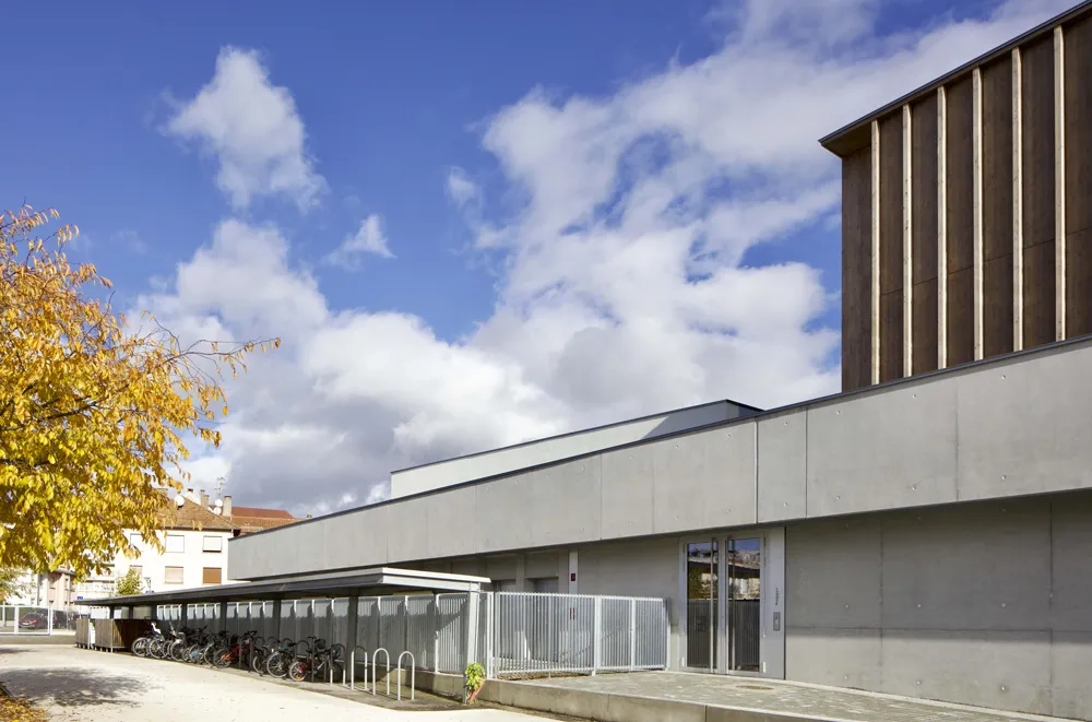 La nouvelle salle vient doubler l’ancien gymnase. Pour maîtriser l’échelle de cet ensemble composé de deux volumes hauts et imposants, les architectes ont eu l’idée de créer un socle carré, qui les enserre et les réunit ; il offre au regard la sensation d’une seule entité bâtie. Un auvent périphérique marqué par un large bandeau en béton accentue l’effet en ceinturant l’équipement sur ses quatre côtés, conférant à chaque façade la même importance. Aucun point de vue n’est privilégié.