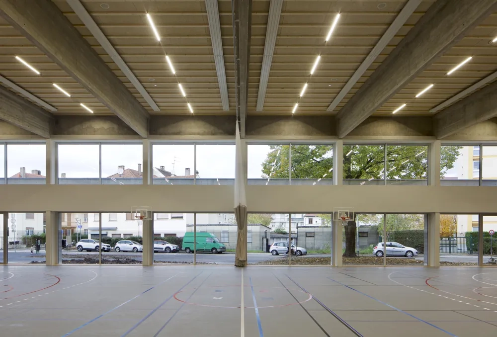 Faire le choix d’un socle béton présentait un dernier avantage. Il permettait de faire le lien en termes de matériaux avec le gymnase existant. En plutôt bon état, le bâtiment nécessitait cependant d’être rénové et surtout mis en valeur, en particulier les poutres coffrées planchette, cachées à l’origine derrière un faux plafond. Elles ont été nettoyées et sont désormais apparentes.
