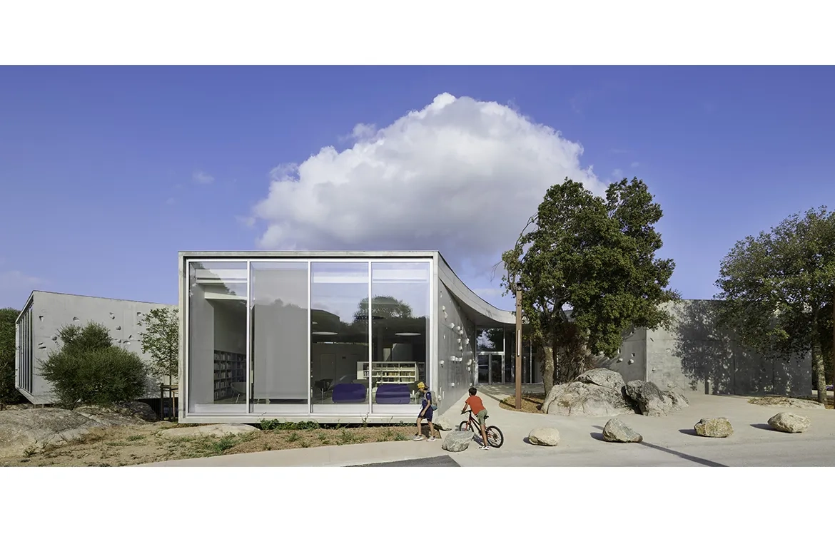 Volume de béton brut, la médiathèque L’Animu, conçue par Dominique Coulon & associés en collaboration avec Amelia Tavella Architectes, se coule au milieu des oliviers.