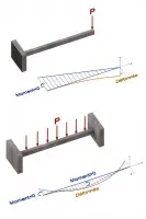 Figure 6. Moment fléchissant dans une poutre console et une poutre bi-encastrée chargées par une force ponctuelle.