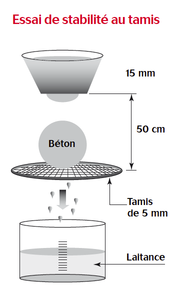 Le pourcentage en masse de laitance passée à travers le tamis, par rapport à la masse de l’échantillon initial, exprime la stabilité du béton. Ce rapport doit être compris entre 10 % et 20 %. Plus il est faible, plus le béton est stable. Au-delà de 20 %, le béton présente un risque de ségrégation.