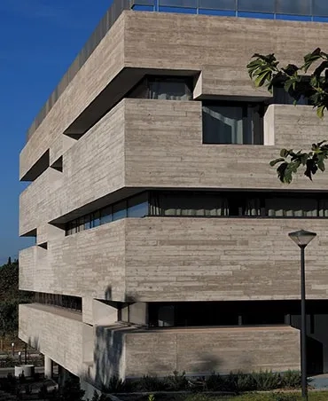 L’alternance des bandeaux de béton de 20 cm d’épaisseur et des bandeaux vitrés placés en retrait des façades périphériques semble se jouer des caractéristiques et du poids des matériaux : le verre semble supporter le béton. Leur réalisation a fait l’objet d’une attention particulière nécessitant un coulage du linteau et du voile en même temps, puis de l’allège. Un jeu de décrochages et d’encoches crée des ruptures dans l’horizontalité des façades. D’inspiration moderne, le bâtiment offre une qualité architecturale particulièrement remarquable dans ce secteur.