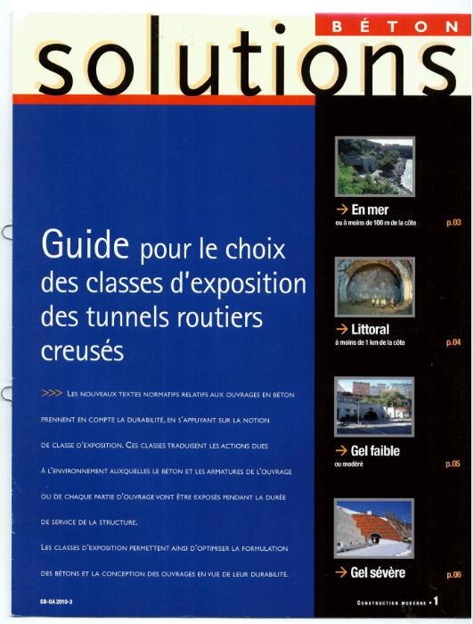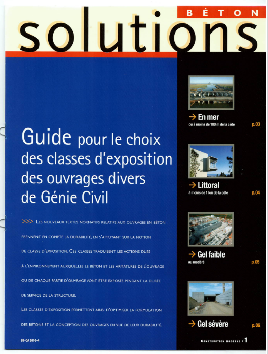 Pour le choix des classes d’exposition d’ouvrages de génie civil, il est conseillé de se référer aux guides (des ouvrages d’art en béton, des ouvrages maritimes et fluviaux en béton, des tunnels routiers creusés, d'ouvrages divers de Génie Civil) de la Fondation de l’École Française du Béton (EFB) :