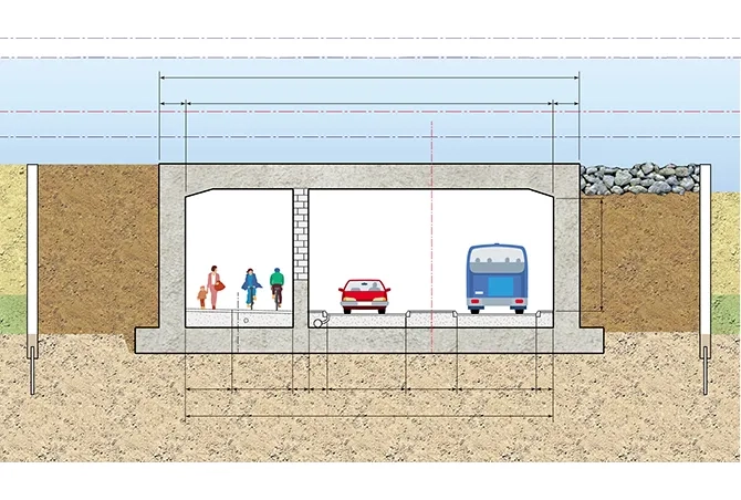 Situé à une cinquantaine de mètres en aval du pont, l’ouvrage souterrain comporte deux espaces de circulation, vidéosurveillés et avec Détection Automatique d’Incident (DAI). Les voitures, les deux-roues motorisés, les bus et les poids lourds ont leur propre tunnel. Les cycles et les piétons le leur, parallèle : une « voie douce » aménagée avec différentes séquences d’ambiance et d’éclairage. Avec deux nouveaux giratoires et leurs rampes d’accès à 6 %, les nouvelles voies routières sont longues de 580 m, dont 250 m souterrains.