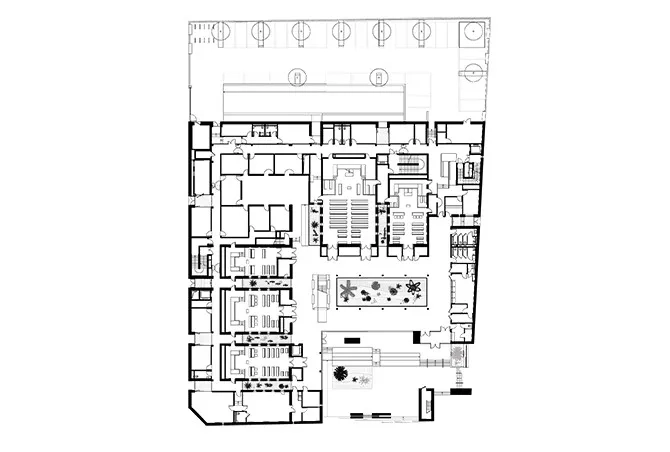 À partir du 1er étage, on trouve les autres patios qui amènent la lumière au cœur du bâtiment. Oliviers, euphorbes et plantes locales leur confèrent une ambiance très méditerranéenne. Aux 1er et 2e étages, l’escalier principal arrive sur un grand palier accessible au public, qui forme une galerie ouverte en balcon sur le rez-de-chaussée et articulée avec les 5 patios. La distribution des différentes juridictions, dont l’accès est contrôlé, se fait à partir de ces paliers qui proposent des espaces d’attente lumineux et agréables. Les bureaux des juridictions s’ouvrent sur les différents patios, ce qui permet à leurs occupants de profiter du calme de ces lieux, de leur paysage végétal et de la fraîcheur qui s’en dégage. Les patios sont dimensionnés pour permettre de moduler les ambiances en fonction des saisons, éviter un trop fort ensoleillement direct en été et pouvoir profiter des apports solaires en hiver et en demi-saison. Les bureaux situés en périphérie, derrière les façades, reçoivent la lumière naturelle par des baies vitrées latérales donnant sur les redans. Les vitrages disposés en fond de redan éclairent les circulations. Ce dispositif assure l’intimité des bureaux par rapport à l’extérieur. Il les protège aussi de l’ensoleillement direct pendant la période estivale, évitant ainsi tous risques de surchauffe et d’inconfort dans ces espaces de travail et de circulation. Les locaux partagés, salles de convivialité (cafétéria), de réunion, etc., sont regroupés au 2e étage, dans la partie qui recouvre le parvis. Ils bénéficient de deux belles terrasses qui agrémentent le confort des lieux.