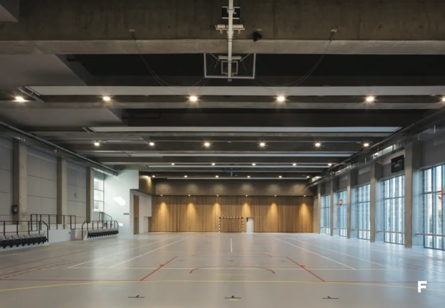 La structure des logements est classique. Celle du gymnase est constituée de portiques (poteau-poutre). Elle devait supporter à la fois le jardin en pleine terre (1 m de haut) implanté sur son toit et une partie des logements le recouvrant partiellement. Avec une portée de 24 m et une trame de 5 m, les poutres mises en place font 1,80 m de haut. Le gymnase est conçu pour répondre aux critères du label HQE® (l’obtention du label est en cours), alors que l’ensemble de logements est certifié NF Logements démarche HQE® et H&E profil A. Concrètement, l’accent a été mis, notamment pour le gymnase, sur le confort acoustique. Il ne devait pas y avoir d’interférences sonores entre les activités dans le gymnase et les logements qui se situent juste au-dessus. En termes de confort thermique, une isolation par l’intérieur, associée aux structures en béton, a permis de répondre aux normes. S’y ajoute la toiture végétalisée de la tour de logements, laquelle reçoit un ensemble de panneaux solaires dédiés à l’eau chaude sanitaire du gymnase. Pour le reste, la dimension environnementale est dictée et, en grande partie, gérée par la ZAC. Chaque construction bénéficie du réseau de chaleur urbain avec une sous-station l’alimentant. Les parkings souterrains sont mutualisés pour chaque îlôt, permettant économie et rationalisation. Une mutualisation reprise pour la gestion des eaux pluviales, avec une répartition par îlot de noues et de bassins de rétention, selon un dispositif parfaitement intégré au projet paysager de la ZAC, plutôt réussi. Côté gestion des déchets, l’opération profite du réseau général de collecte pneumatique. Et, même si ce quartier en devenir peine à trouver son identité, ce n’est pas le cas du projet de l’agence Valéro Gadan qui a su s’imposer dans un paysage pour le moins hétéroclite.