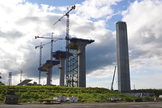 Le tablier du pont à haubans a quant à lui été construit en place, voussoir après vous-soir, grâce à quatre équipages (coffrages) mobiles, pesant chacun 240 t, et ce, de manière parfaitement symétrique. « La construction était symétrique par rapport à chacun des pylônes, pour éviter les déséquilibres de charges », précise Laurent Agostini, directeur technique du projet pour Vinci Construction Grands Projets.