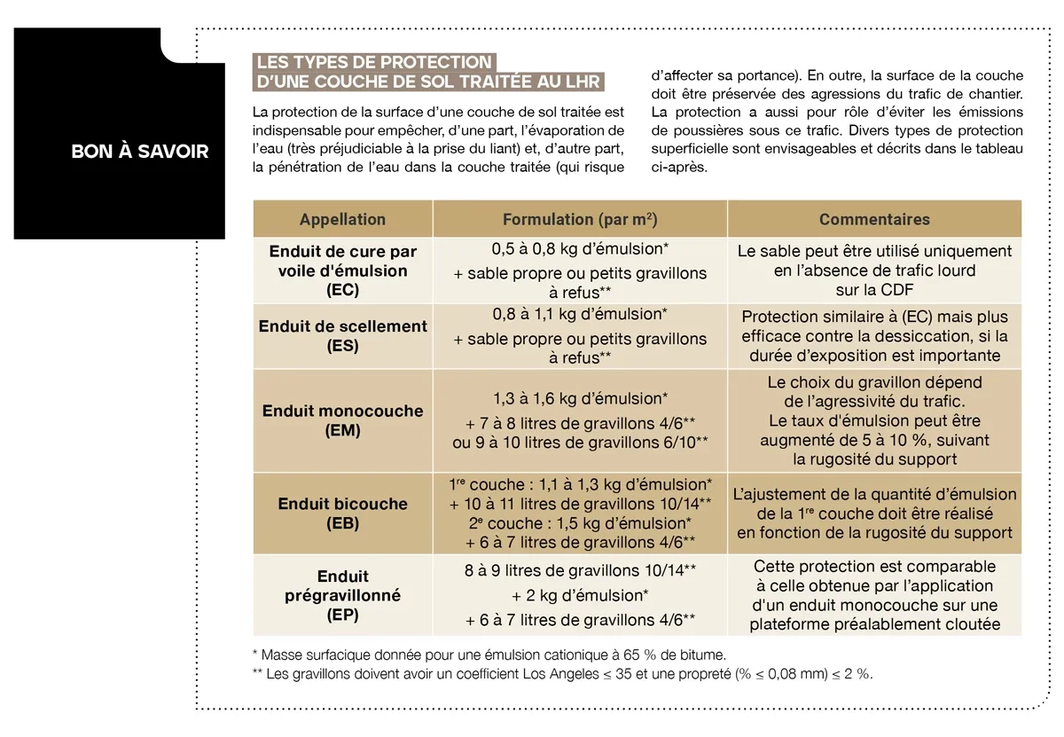 - Cure de la couche traitée au moyen d’une couche d’émulsion (à 65 % de bitume) gravillonnée 4/6 mm.
