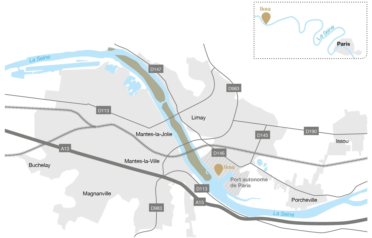 Le nouveau centre de distribution clients d’Ikea est en cours de construction dans le port de Limay. À une soixantaine de kilomètres à l’ouest de Paris, la commune de Limay bénéficie d’une position stratégique à proximité immédiate de l’autoroute A13 et au bord de la Seine, ce qui lui permet de rayonner, d’une part, sur l’Île-de-France et, d’autre part, vers l’Ouest. En effet, l’A13 assure la liaison entre Paris et Caen, en passant à proximité de Rouen, et se connecte avec les autoroutes A28 (Abbeville-Tours) et A29 (reliant l’A13 à hauteur de Beuzeville à l’A26 à hauteur de Saint-Quentin). Situé sur la Seine, le port de Limay permet de relier le centre de distribution soit à Paris, soit à l’Ouest et au Havre par voie navigable.