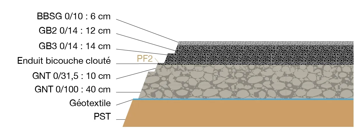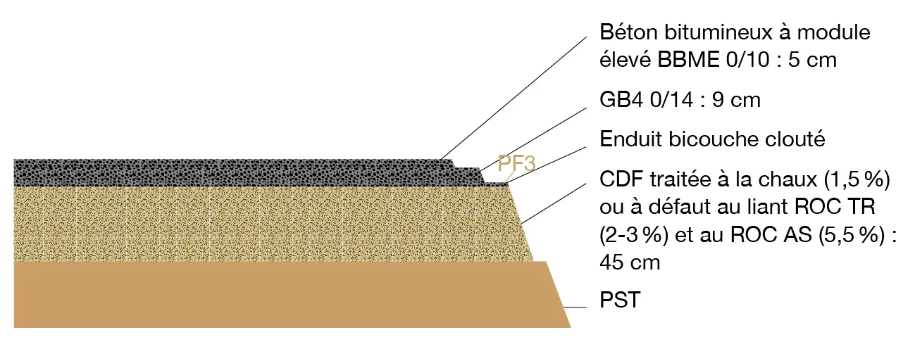- D’une couche de base en grave-bitume de classe GB2, 0/14 mm, d’épaisseur 12 cm ;