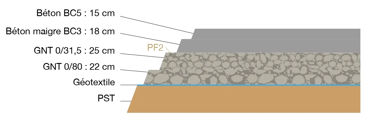 - D’une couche granulaire 20/40 mm, d’épaisseur 14 cm, permettant d’augmenter la portance de la plateforme de PF2 à PF2qs, soit 80 MPa au minimum ;