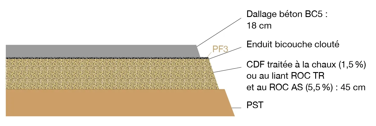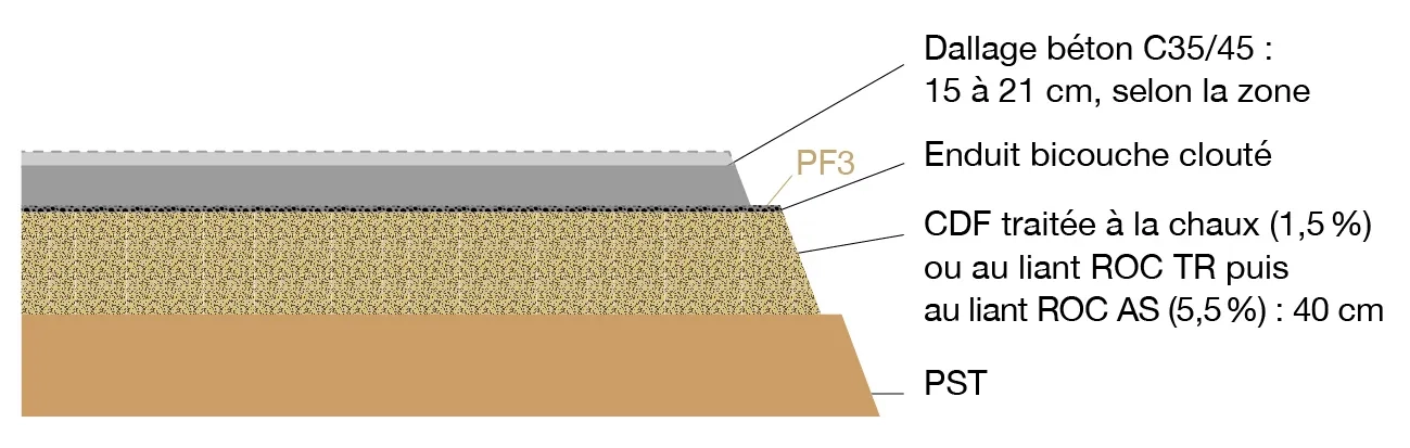 En ce qui concerne les zones de béquillage, Mendes a mis en œuvre un revêtement en béton de classe mécanique BC5, de classe d’exposition XF2 et d’épaisseur 18 cm, placé directement sur la CDF traitée.