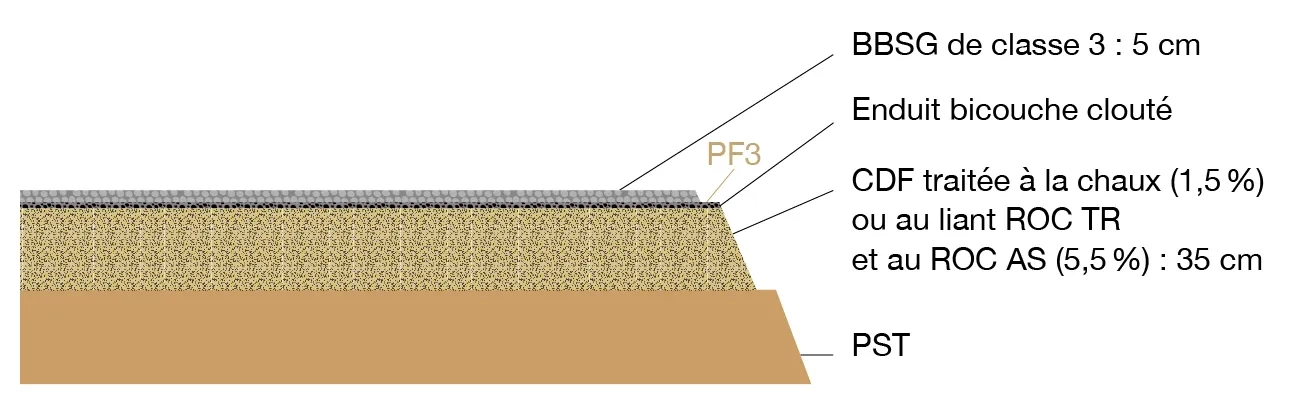 - D’un enduit bicouche clouté, qui assure la protection de la CDF, associé à une couche d’accrochage pour assurer le collage à l’interface entre la CDF et la structure de chaussée ;