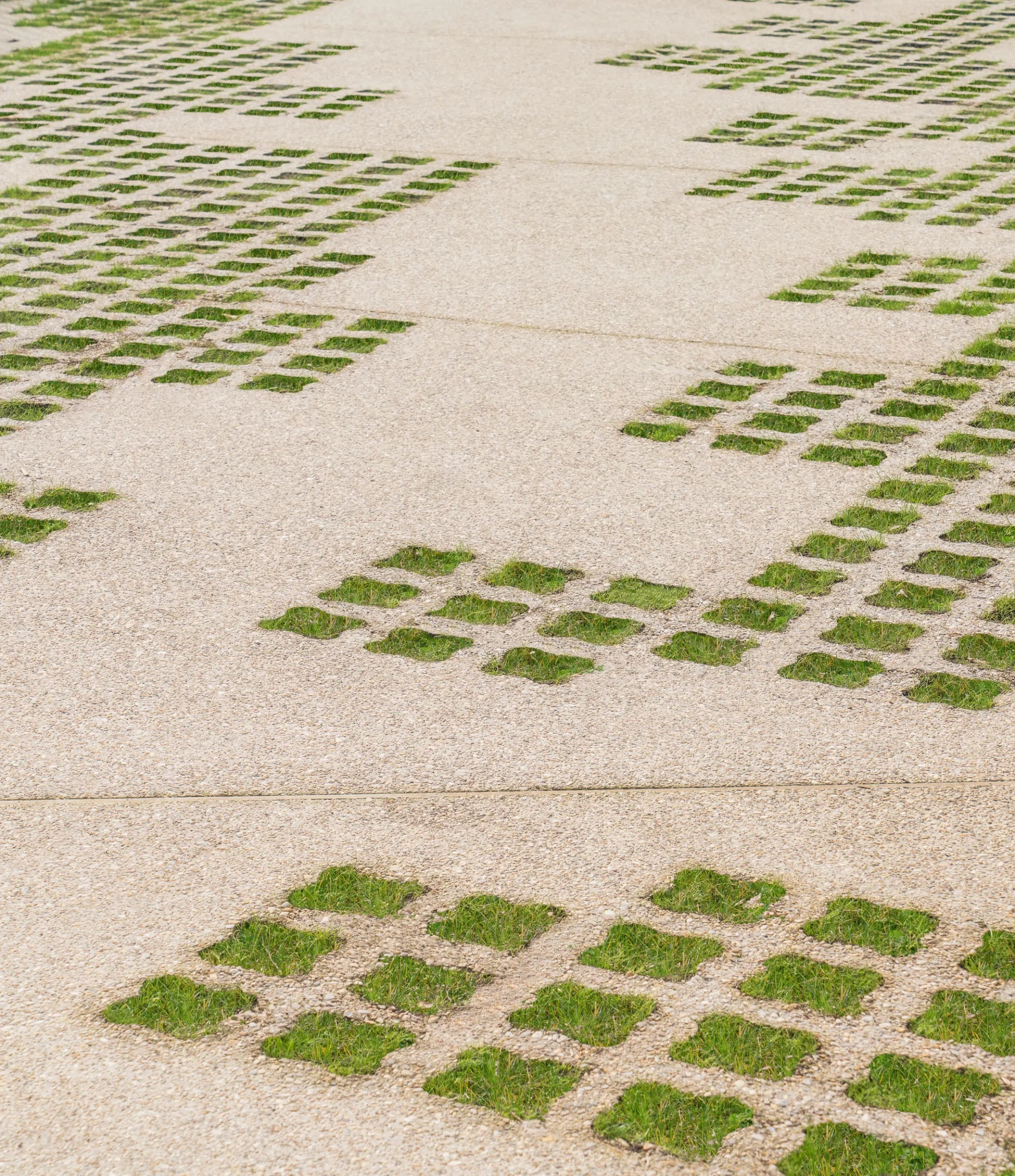 La superficie totale du projet est d’environ 1 500 m², impliquant une planification rigoureuse. « Nous avons utilisé un béton alvéolaire façon “pixels” et un béton désactivé, chacun ayant des caractéristiques esthétiques et fonctionnelles distinctes », explique Mathieu Morel. Le granulat choisi est local, de granulométrie limitée à 10 mm (D10), de couleur beige clair, afin de minimiser l’empreinte carbone « transport » du projet et, toujours dans la même démarche, le ciment utilisé, un CEM II 42,5 R, est également produit localement. La désactivation du béton a été gérée avec un produit désactivant biodégradable, permettant une gestion respectueuse de l’environnement, tout en offrant une esthétique agréable.
