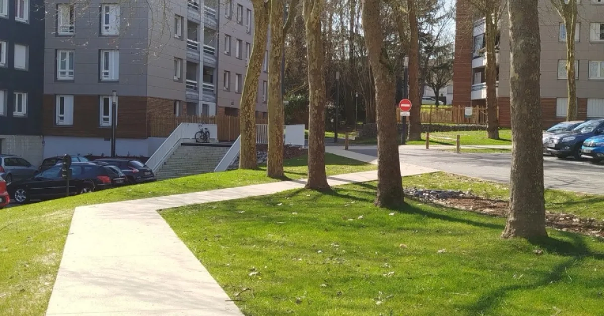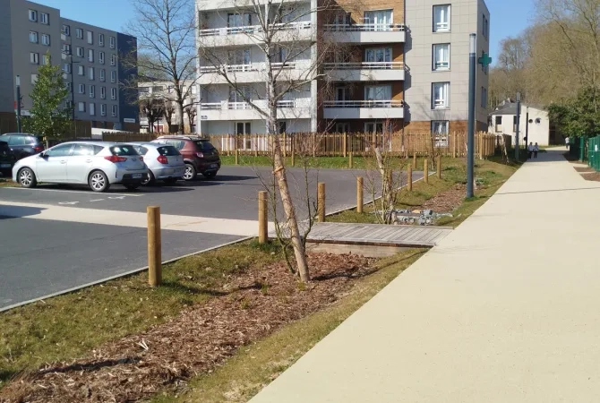 Le projet, dont la réalisation s’est achevée en 2024, intègre également d’autres matériaux, comme des pavés en béton, de l’enrobé et des solutions en matériaux stabilisés aux liants hydrauliques. Les arêtes du béton ont été réalisées par la mise en place de coffrages en amont du coulage, rappelant que le béton se maintient seul après durcissement, avec des jonctions par chaînettes de pavés. Cette diversité de matériaux permet d’enrichir l’espace, tout en répondant aux besoins fonctionnels des usagers.