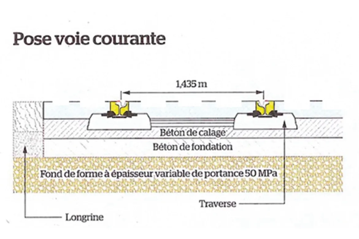 Tout au long du tracé en cours de réalisation, la largeur des plates-formes est fixée à 6,20 m. La portance minimale de la couche de forme (40 cm de grave non traitée) a été mesurée partout à 50 MPa. « La géologie du sous-sol ne pose pas de problème, même si les nappes phréatiques ne sont pas très profondes », indique Jean-Claude Butstraen, directeur du projet pour TSO. La couche de fondation est constituée d’un béton BC3 (19 cm pour une pose classique et 29 cm pour une pose avec atténuation), sur lequel est posé sans ancrage un béton de calage BC5 (sur 19 cm).