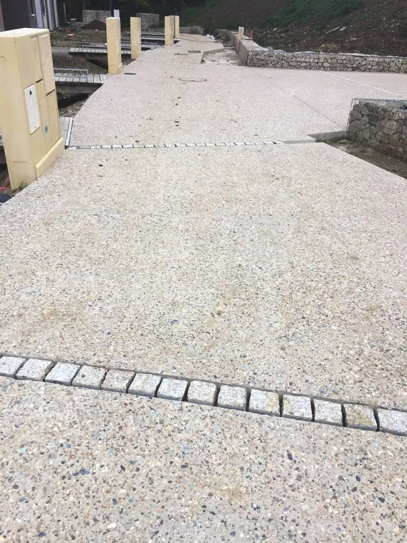 « Le béton est réglé de façon traditionnelle, détaille Sébastien Bonnaffé. Puis on dissémine des cailloux à la surface du béton frais. Nous les incorporons au lissage, de telle sorte qu’ils restent visibles. Enfin, nous saupoudrons du désactivant, qui fait office de cure. Le lendemain du coulage, au moment du lavage, les cailloux apparaissent comme s’ils étaient fondus dans la masse du béton, alors qu’ils n’affleurent qu’à la surface. Cela permet d’utiliser une quantité précise et limitée de cailloux, tout en apportant une véritable plus-value par leur qualité esthétique. Cette technique dite du cloutage/désactivation est intéressante. Par ailleurs, compte tenu de leur granulométrie importante (jusqu’à 40/80), ces cailloux ne pourraient pas passer au niveau des trémies d’une centrale à béton. Autre particularité du chantier ?